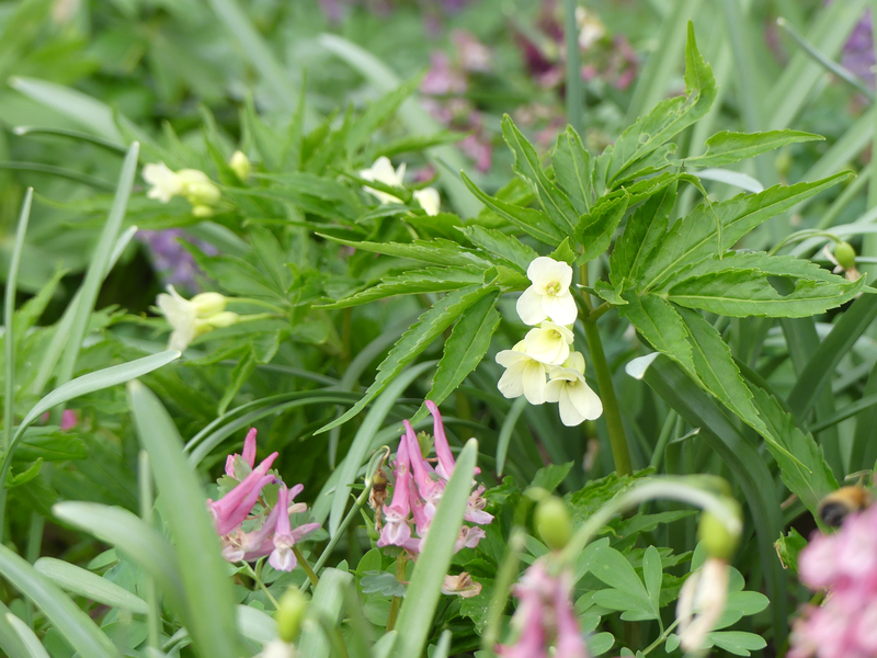 Cardamine yezoensis ist jetzt in Hochform. Vor 2(?) Jahren war ich erstmal erfreut und dann stark verunsichert, dachte Giersch gekauft zu haben und habe in einer Panikattacke alles rausgerissen, versprochenes abgesagt. Wie sich dann im nächsten Jahr herausstellte, nur fast alles und diesmal Ruhe bewahrt: Kein Giersch, wenngleich das Blattwerk doch recht ähnlich ist. Jetzt also in voller Schönheit: