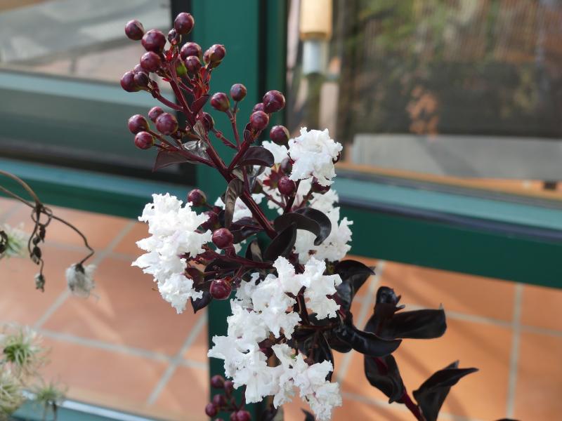 Ich freue mich über die ersten Blüten von Lagerstroemia Black Diamond™ Pure White: :D