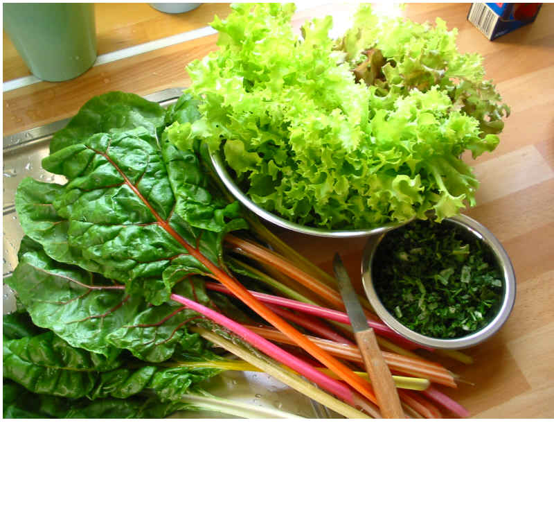 Heute bunter Mangold und der erste "Salanova"-Salat (der nicht umgepflanzte, der in der Saatreihe gerade unter Mangold und Beeten "untergeht").Und Kräuter (schon gehackt).