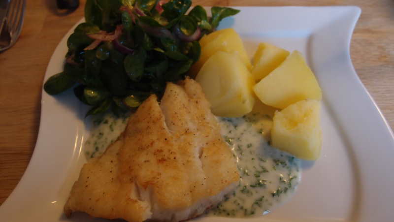 und gestern mehlierter heilbutt mit petersiliensoße, salzkartoffeln und ackersalat.