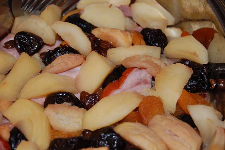 Heute gab es Pellkartoffeln und die Reste dieses Gerichts - Kasslerscheiben in verschiedenem Trockenobst.