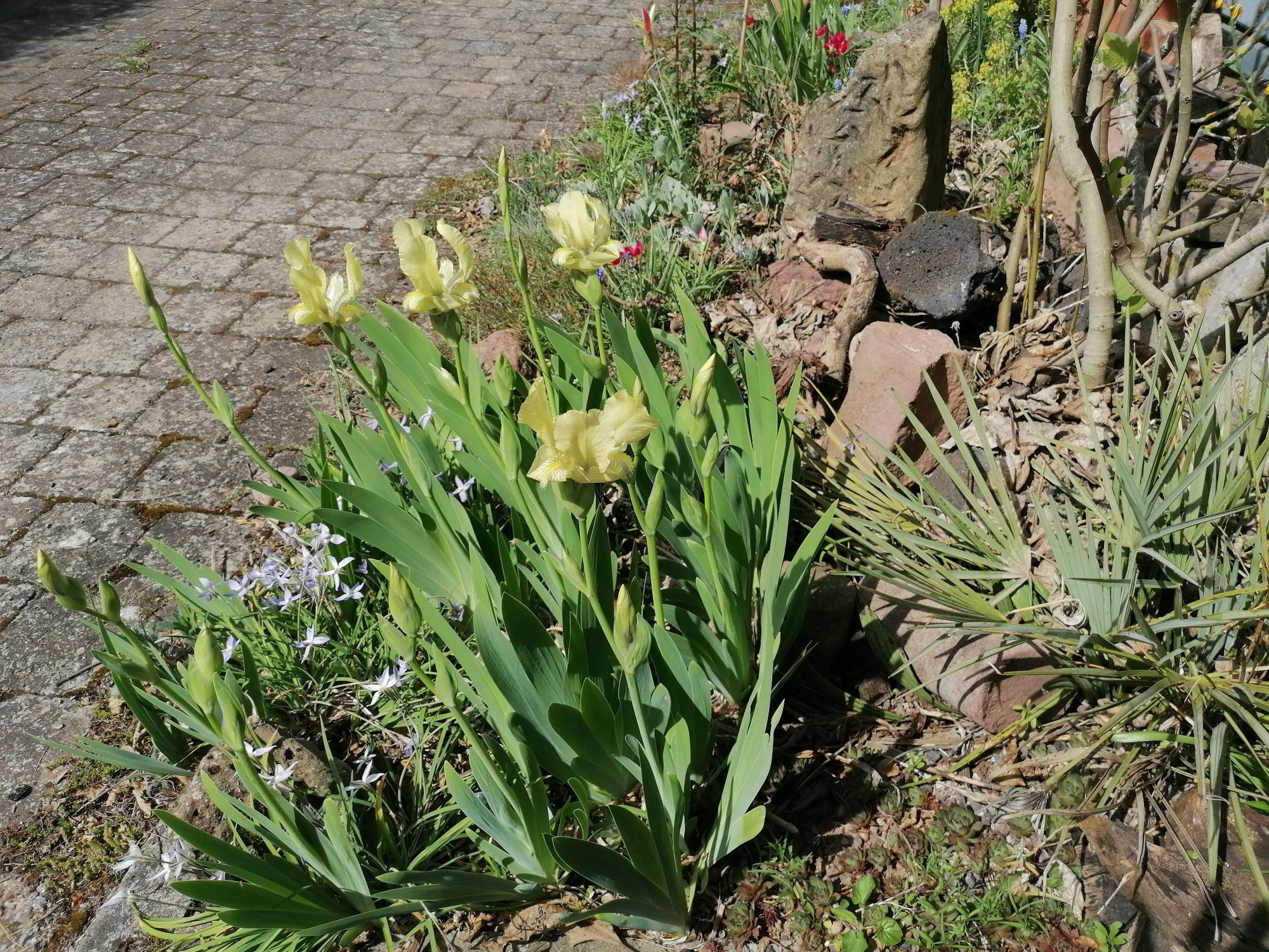 Dann die wohl falsch benannte Iris imbricata aus dem Boga Würzburg, daneben ein Bonsai von Chamaerops cerifera, schon bestimmt 15 Jahre alt