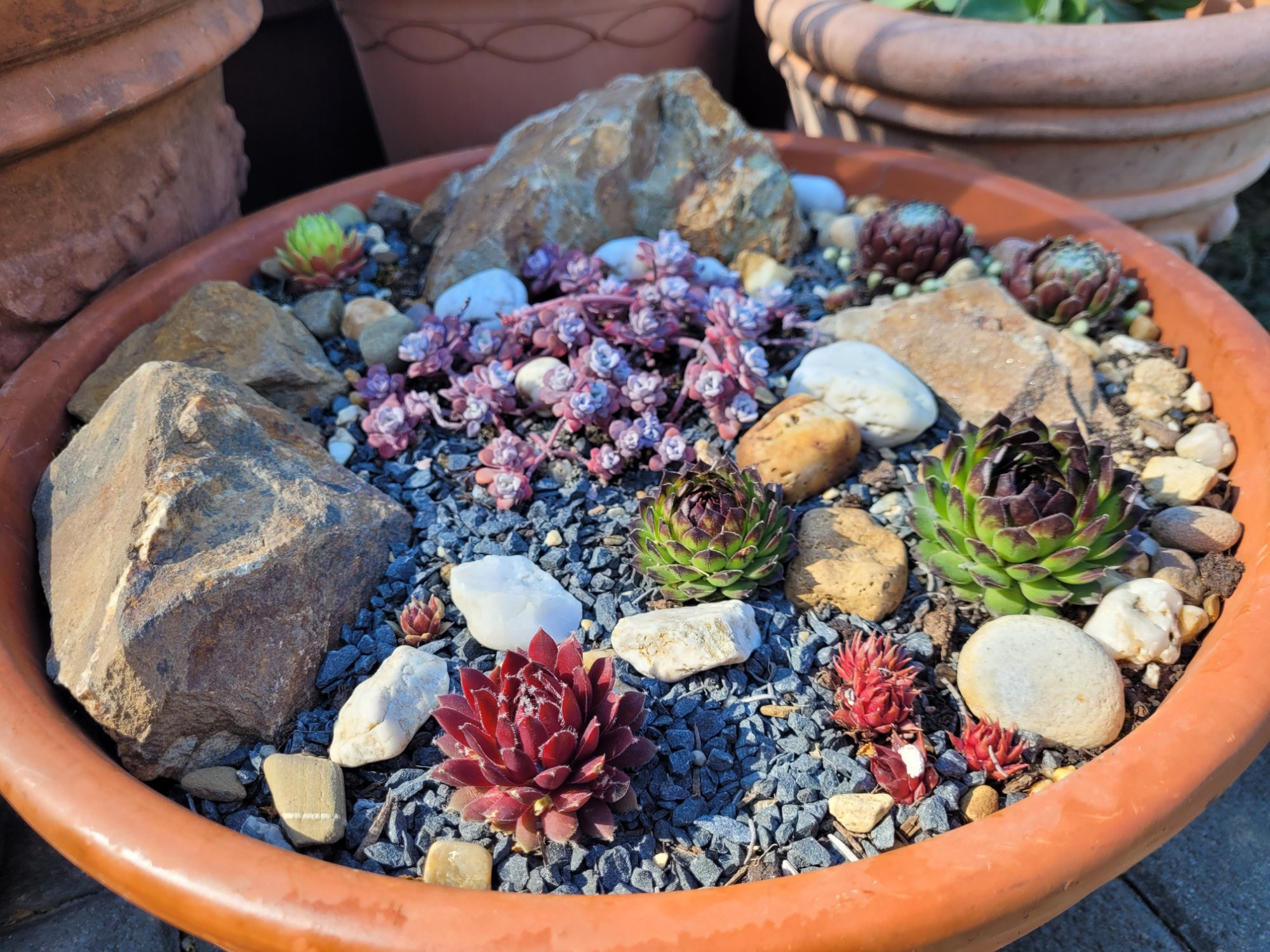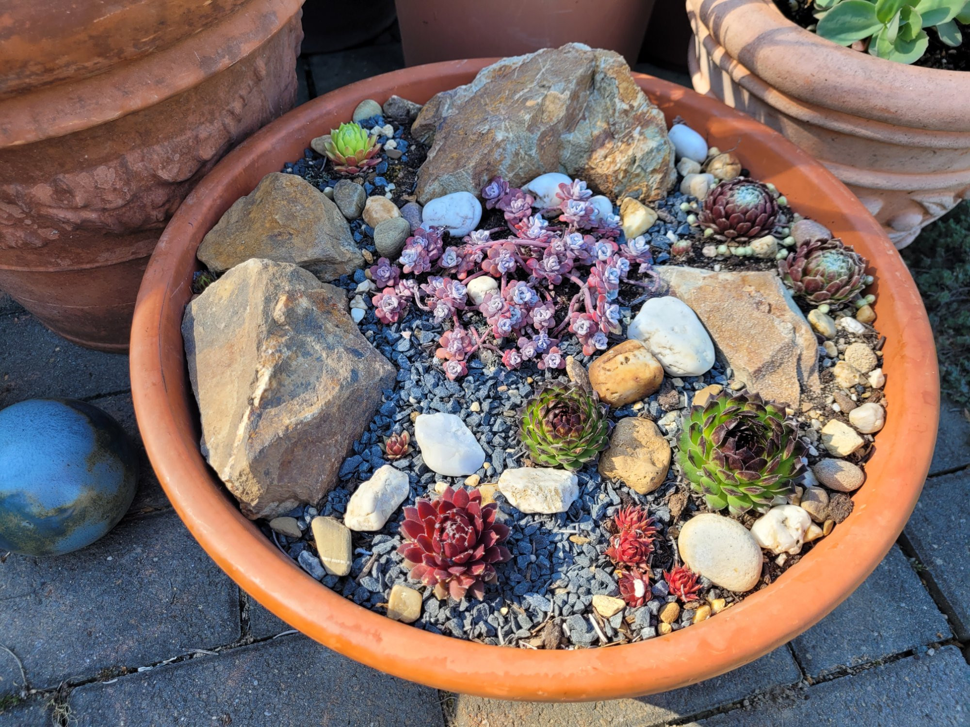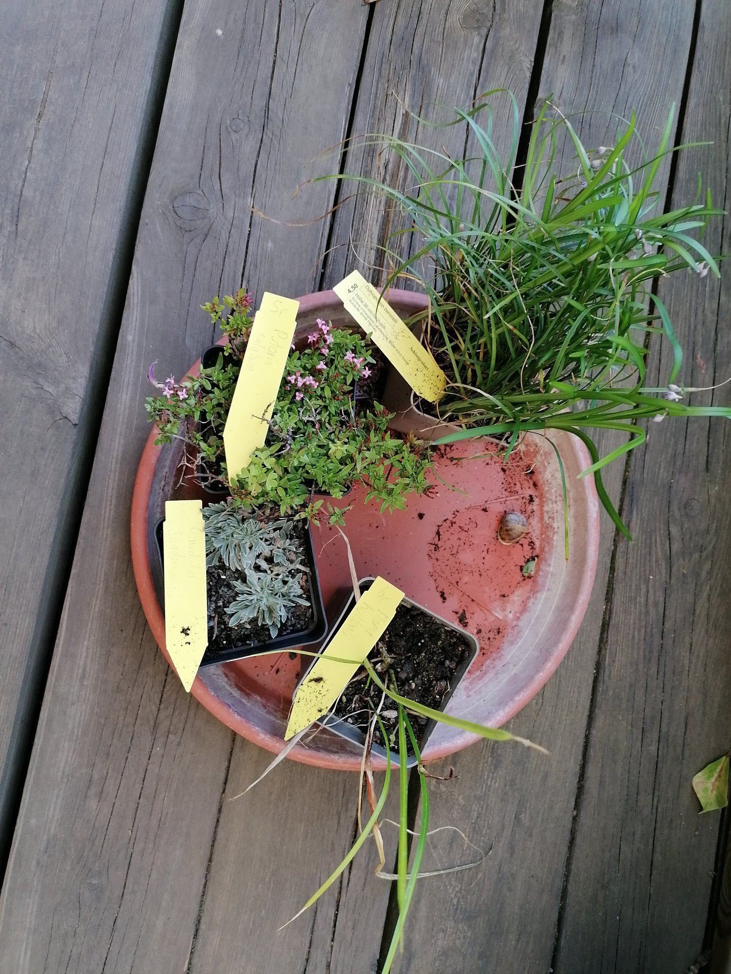 Wenn ich Mediterraneus bepflanzen Felgen so sehe, habe ich ja in diesem Frühjahr auch eine Mini Garrigue gepflanzt. Ich bekam eine größere Tonschale geschenkt und habe einen Teil meiner Hauswurzen darin untergebracht. Cool... muß natürlich alles noch wachsen.