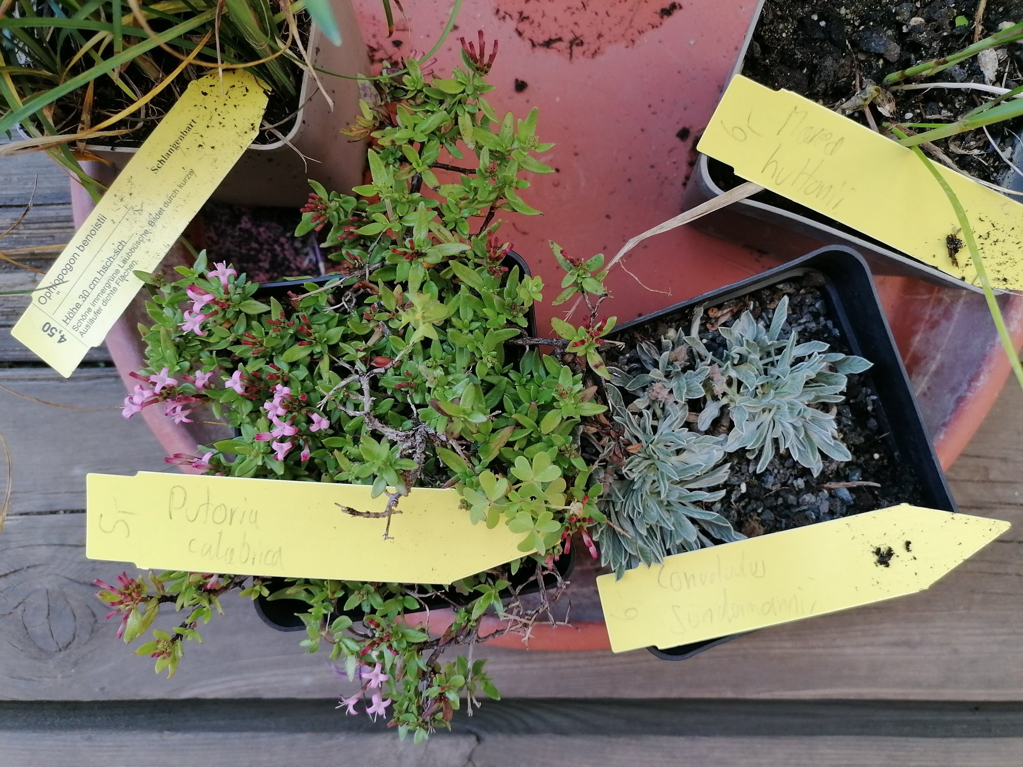 Edit: Etiketten kann man schlecht lesen Convolvulus sündermannii, Moraea huttonii, Putoria Calabria und Ophiopogon benoistii.