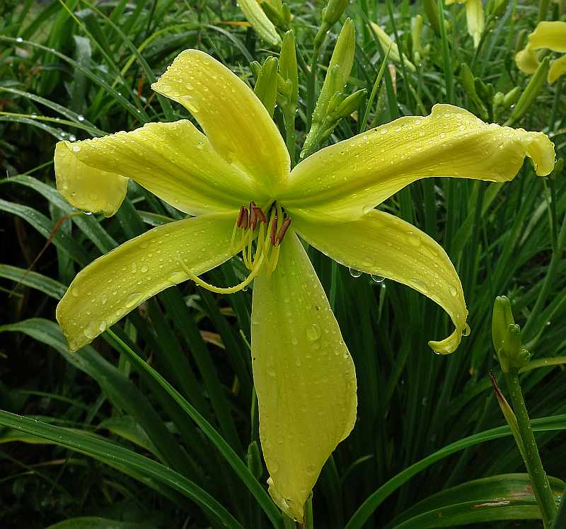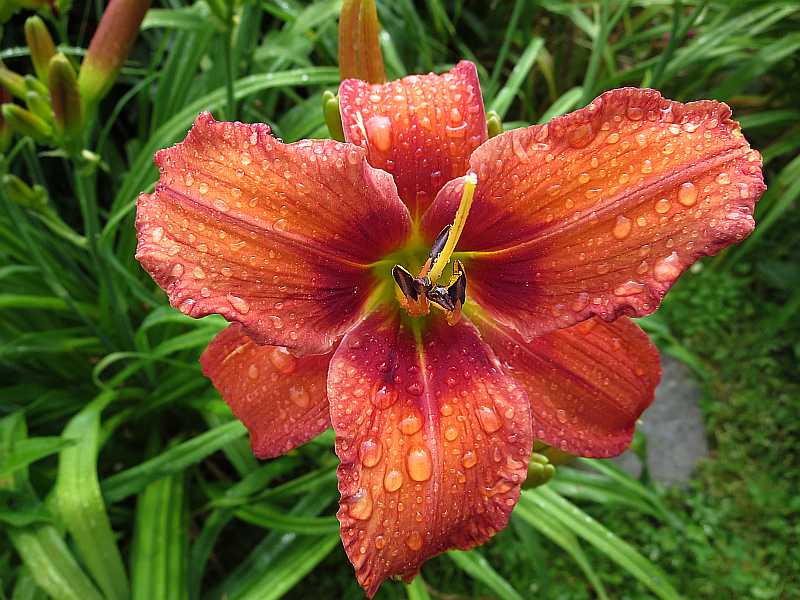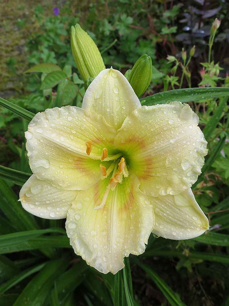 Ist ein hübsches Ding.Nach dem nächtlichen Regen (25ml) und tagsüber mit kurzen Unterbrechungen kräftigen Schauern kann ich heute nur eine wirklich gute Blüte bieten von einem Sämling (schon 4 Jahre alt).Öffnet gut und hat eine feste Substanz. Er war aus gekauftem Samen.