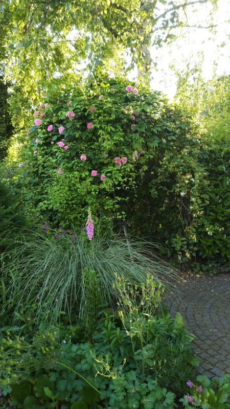 Die Ghislaide de Feligonde kletterte eigentlich in eine Kiefer. Die mussten wir aber fällen. Ich dachte, ich könnte sie als Strauchrose ziehen. Jetzt hat sie sich aber über einen Ilex und verschiedene Stauden gelegt.