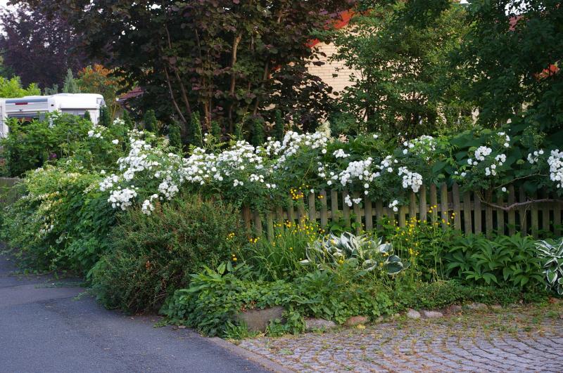 Noch ein Bild vom Zaun an der Straße: "Rambling Rector" und Lonicera jap. Halliana wachsen so üppig, dass der Zaun teilweise kaum noch zu sehen ist.