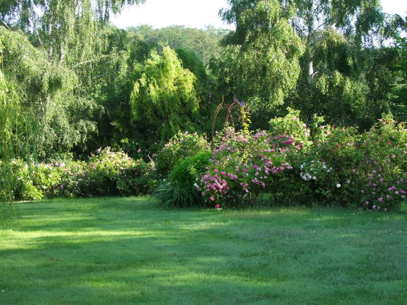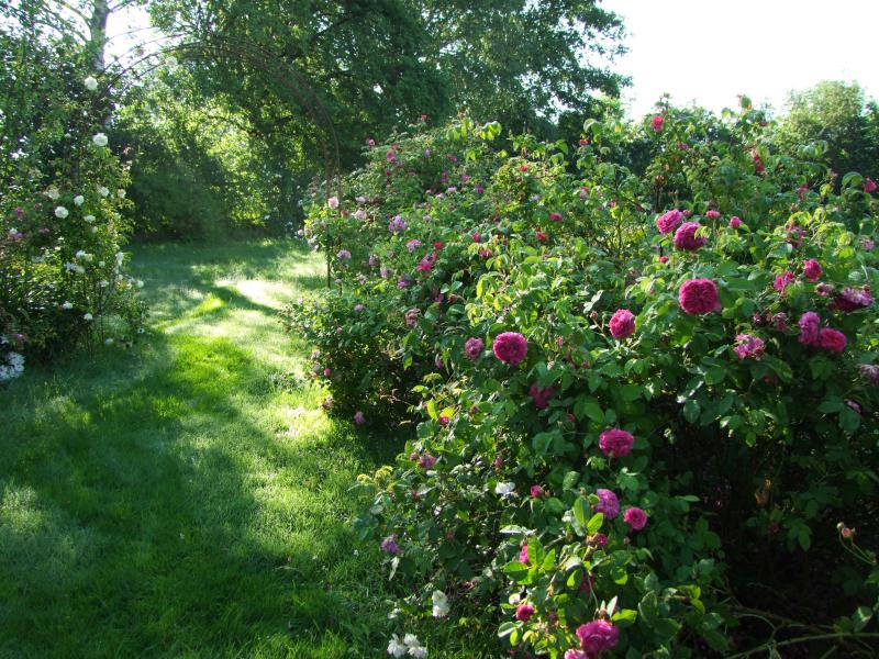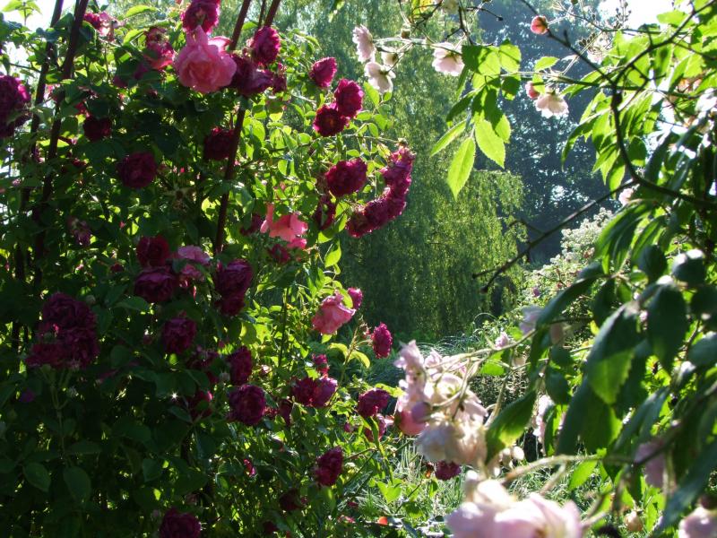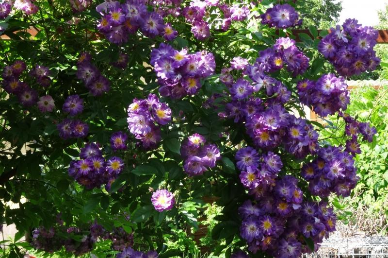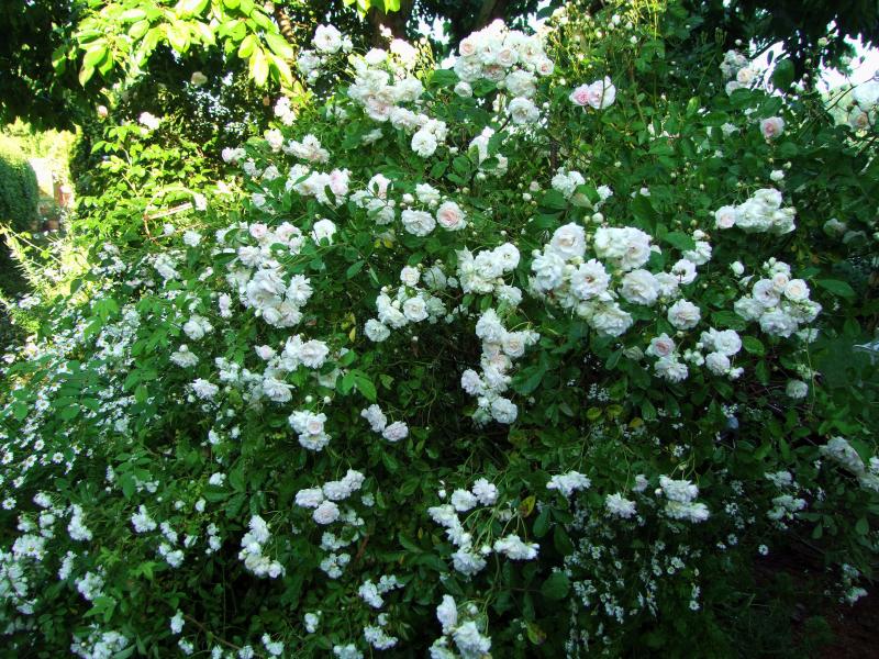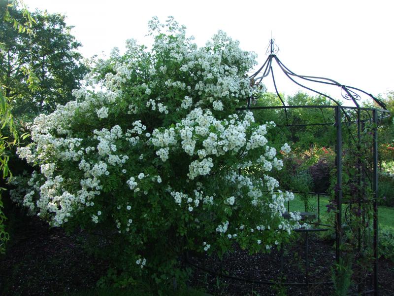 Die Rose hatte vor zwei Jahren, als sie von den sie bedrängenden Koniferen befreit wurde, noch zwei lebende Zweige. Und eigentlich hatten wir schon das Urteil gefällt. Aber im vergangenen Jahr kamen die ersten zaghaften Blüten und in diesem Jahr hat sie das alte Pavillongerüst erobert.