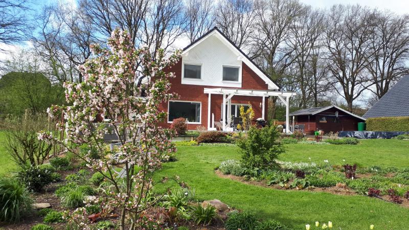 Ja, ich hatte ja länger überlegt was statt der düsteren Fichten dorthin passen und auch gedeihen könnte. Der Red Sentinel scheint nach erfolgter Bodenverbesserung keine Probleme zu haben.