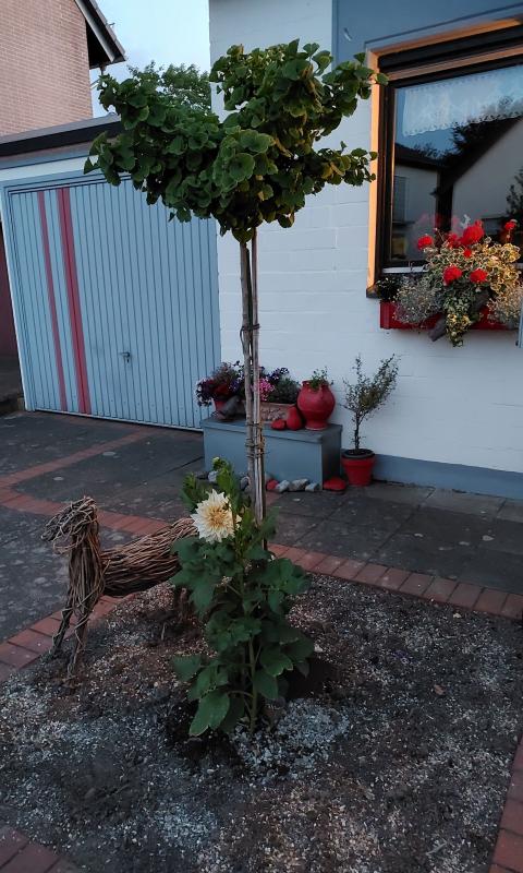 Dies ist jetzt mein Mohnbeet vorne. Katzenklo mit falscher Dahlie, Ginko und Schaf. Das wird jeden Tag umgerempelt. Ich ernte 3 Katzenküttel pro Tag mindestens.