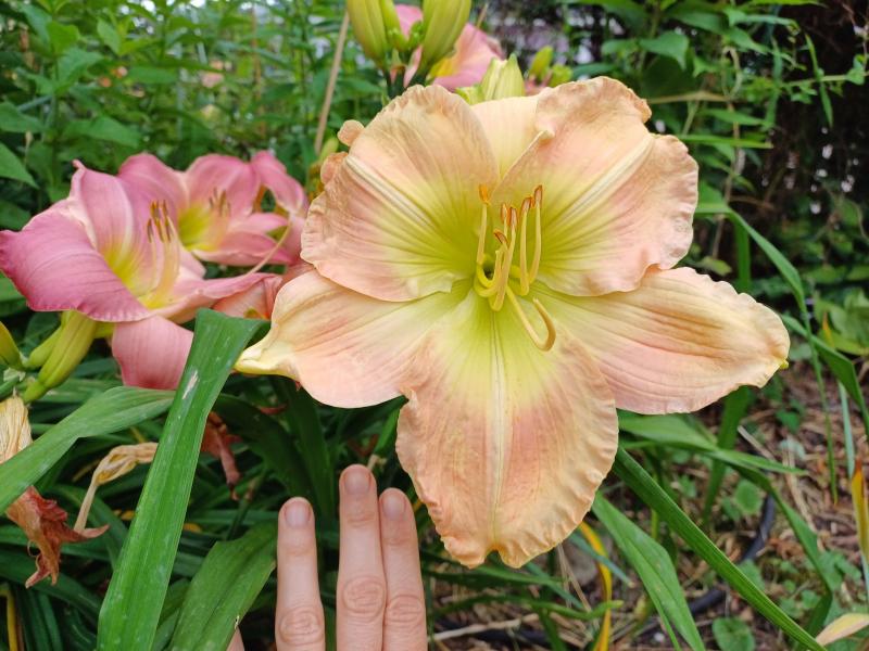 für den Größenvergleich, direkt daneben ist eine normal großblütige Sachsen pink diamond blüte