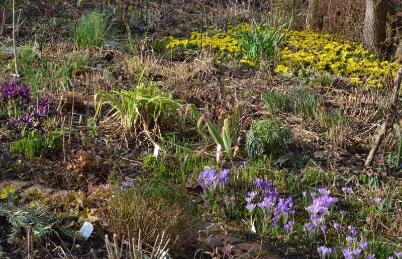 Wenn die Narzissen einziehen, muss man schon für eine Weile starke Nerven haben. ;) In der besagten Ecke wird das Laub aber gnädig vom austreibenden Goldfelberich verdeckt, und dort fällt zum Glück noch nicht mal der hier ansonsten leicht hüfthohe Schachtelhalm auf.