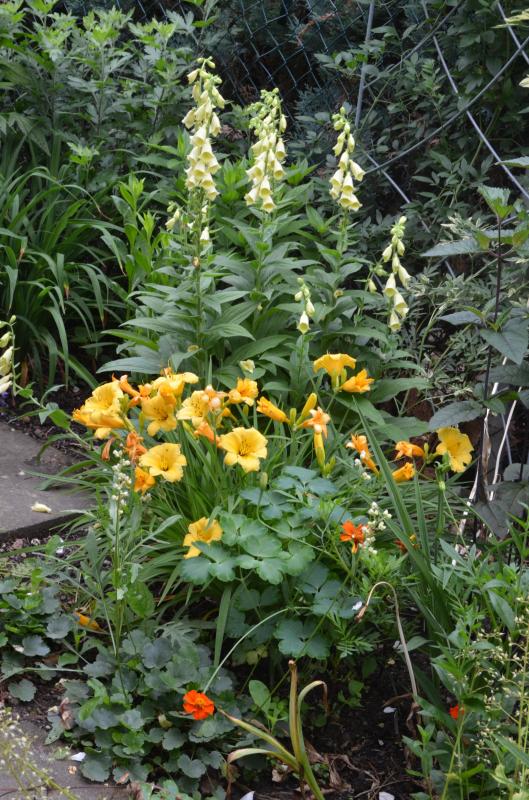 Fingerhut mit unterschiedlichen Hortensien und Rosen im Hintergrund. Sonniges Beet an der Westseite des Hauses.