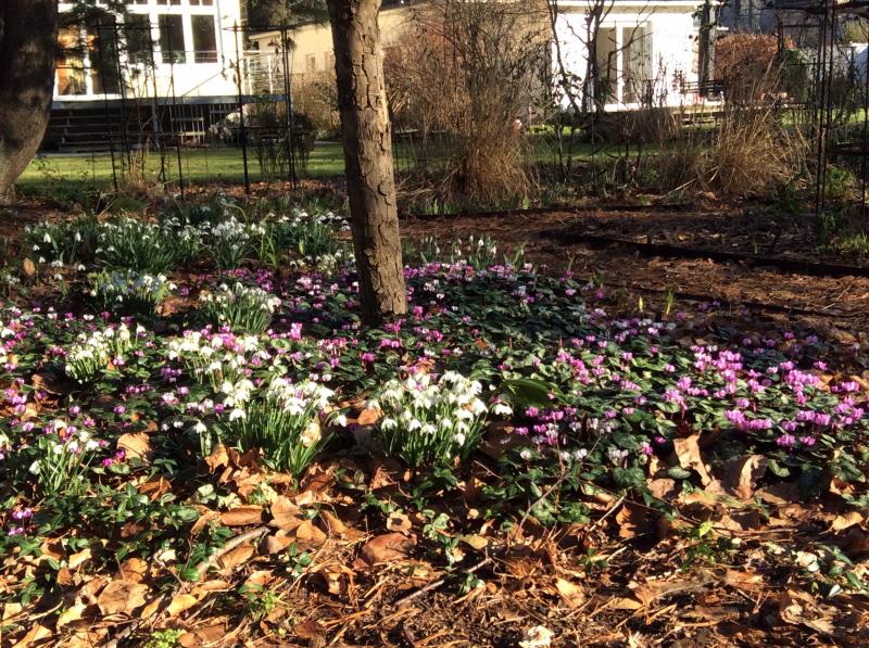 Von solchen herrlichen Blütenteppichen, wie Kai W. und APO1 sie gezeigt haben, kann ich vorerst nur träumen, aber die kurz vor Weihnachten gepflanzten C. coum blühen immer noch reichlich - da würde es mich keineswegs wundern, wenn sie sich etwas verausgaben und nächstes Jahr ein wenig schwächeln. Aber gut, solange sie sich überhaupt etablieren, ist's mir recht, auch wenn ich ahnungsloserweise das (allerdings nicht sehr reichlich vorhandene) Topfsubstrat nicht entfernt habe.