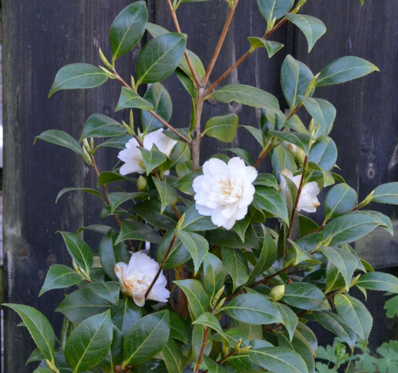 Die weißen Kamelien gefallen mir in den Gewächshäusern immer sehr gut, aber in meinem Garten hatten sie durch schlechtes Wetter immer braune Flecken auf den Blütenblättern, sodass ich mir geschworen habe, im neuen Garten keine weißen mehr zu pflanzen. Und was mache ich: Pflanze ´April Snow´, die mir unter Glas in der Gärtnerei wieder so gut gefallen hat. ???