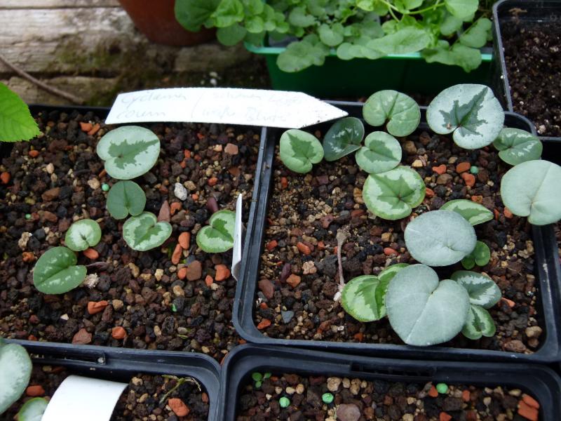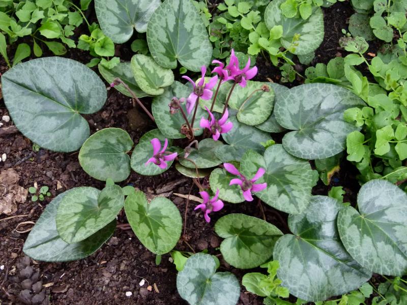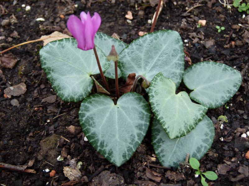 C. coum "silver leaf, dark purple flowers", eine Pflanze, die in seinerm katalog eher eigenartig als wirklich schön aussah: fast weißes laub und dazu der Kontrast der ganz tief dunkel-violetten Blüten.