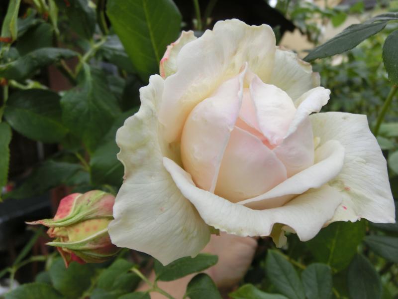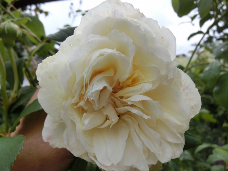 Vor zwei Jahren hat mein Mann einen Rosenhochstamm mitgebracht, den er im Thomas Philipps aufgegabelt hat. Auf dem Schild stand nur "Englische Rose weiss".