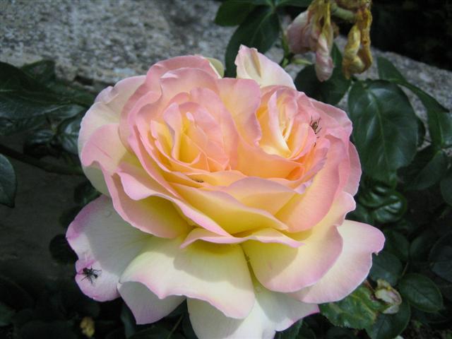"Und sie umschmeichelte die Rose Peace mit ihrer ungleich besonderen Farbkombination in zartrosa/ mimosenbleichem gelb"....... grrrrrr!