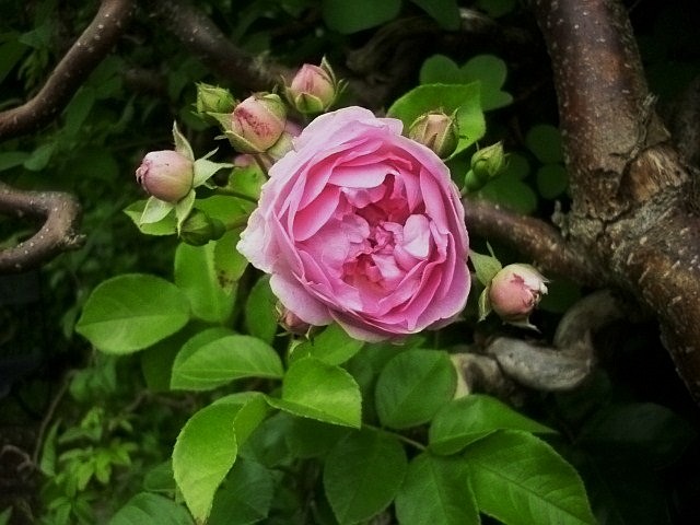 reine des violettes gehört zu den rosen, die im vorletzten winter total zurückgefroren waren. sie trieb nach langem warten dann erst sehr spät im jahr aus und hat letztes jahr nicht geblüht.hier ist sie wieder, aber noch klein.