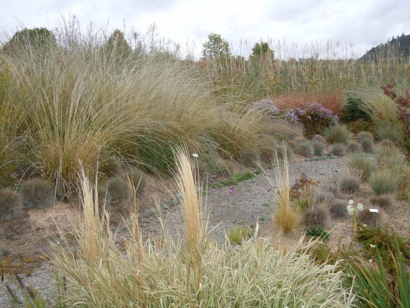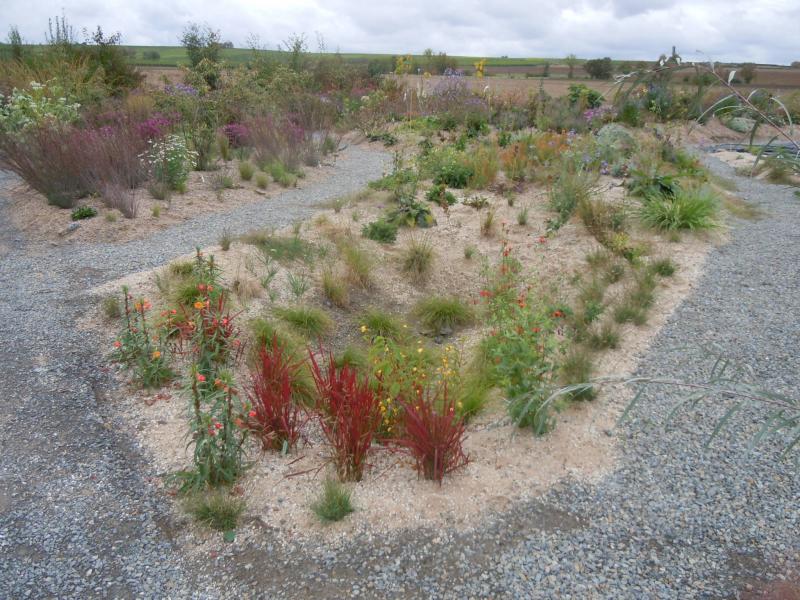 Dort sind auch (sparsam verwendet) frisch gepflanzte Gehölze drinnen, Asimina triloba und Salix exigua z.B. Dazwischen überall Wege, sind ja Schaubeete. Ich habe jetzt speziell die Beete gezeigt, wo die Stauden direkt in Sand gesetzt sind.