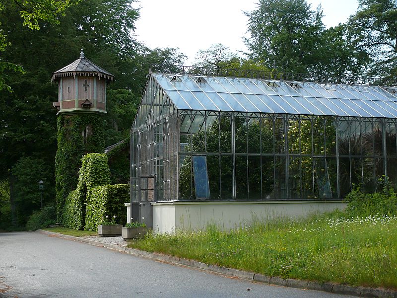 Gewächshaus mit einer Pillnitzer Kamelie und Taubenschlag im Eckbergpark.