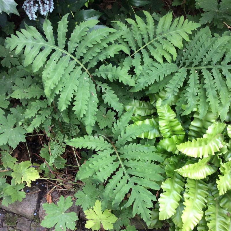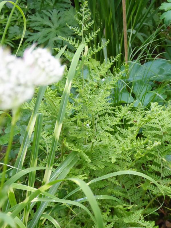 Aus der etwas größeren Abteilung macht sich Athyrium f.f. Corymbiferum besonders gut: