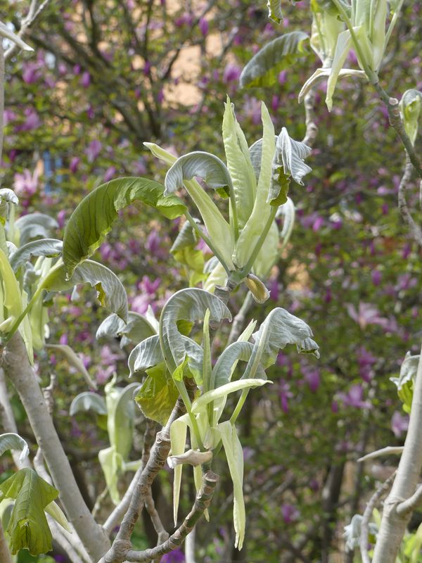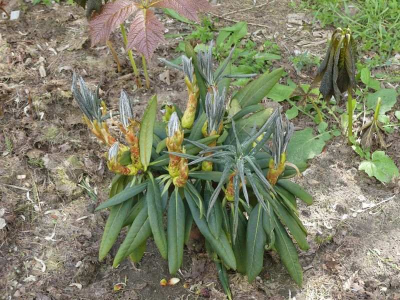 Bei den Rhodos gab es hier alles. Die frühen Arten wie Rh. calophytum hatten den gesamten Neuaustrieb schwarz.