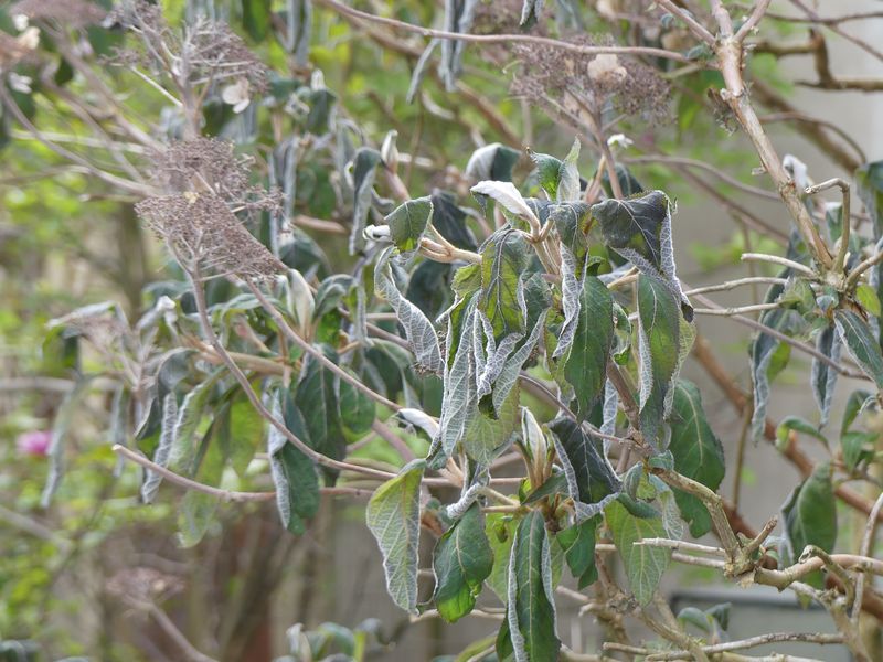 Bei den Rhodos gab es hier alles. Die frühen Arten wie Rh. calophytum hatten den gesamten Neuaustrieb schwarz. Diejenigen, die noch knospig waren, haben keine Schäden. Alle Blütenknospen haben überlebt, geöffnete Blüten haben vor allem zuoberst in den Sträuchern gelitten.