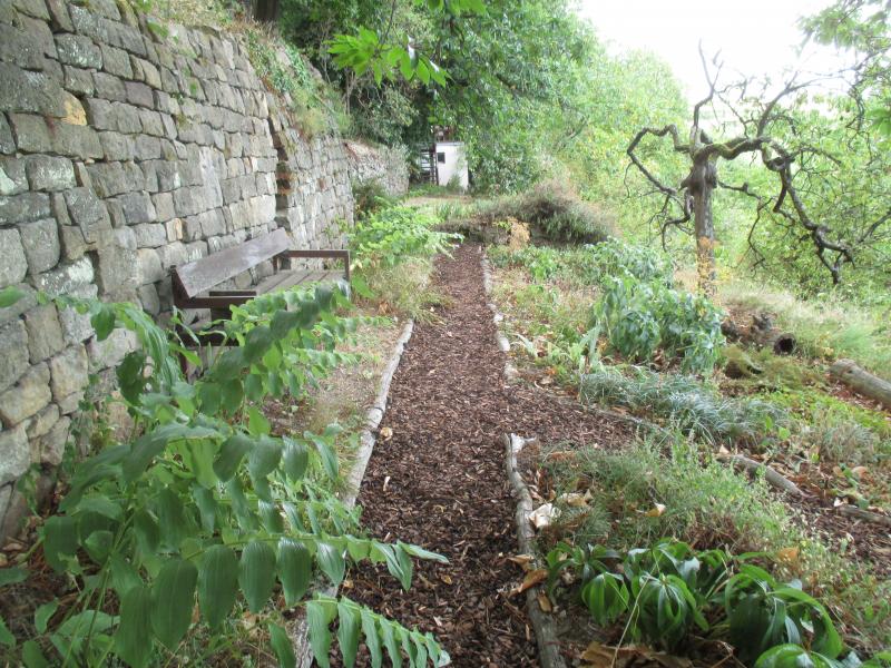 Wenn man sich umdreht sieht man das Waldrandbeet und im Hintergrund das Gartenhaus.