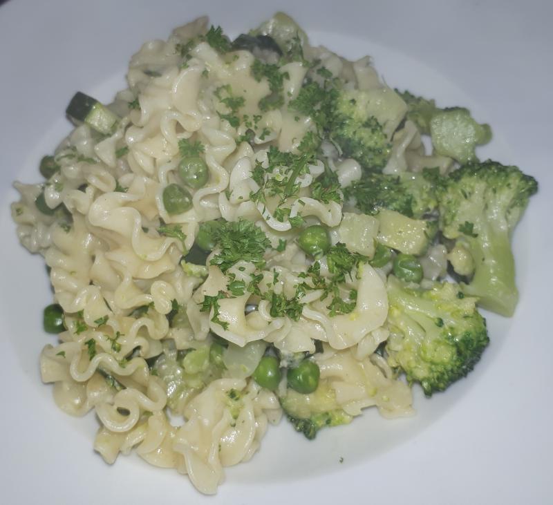Pasta mit Brokkoli, Zucchini und Erbsen in Gorgonzolasoße. Etwas blass geraten.