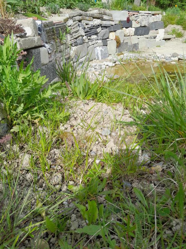 Ein Versuch, das ganze Trockenmäuerchen zu zeigen. Ich stehe in der südlichen Wiese und fotografiere in Richtung Nordost: