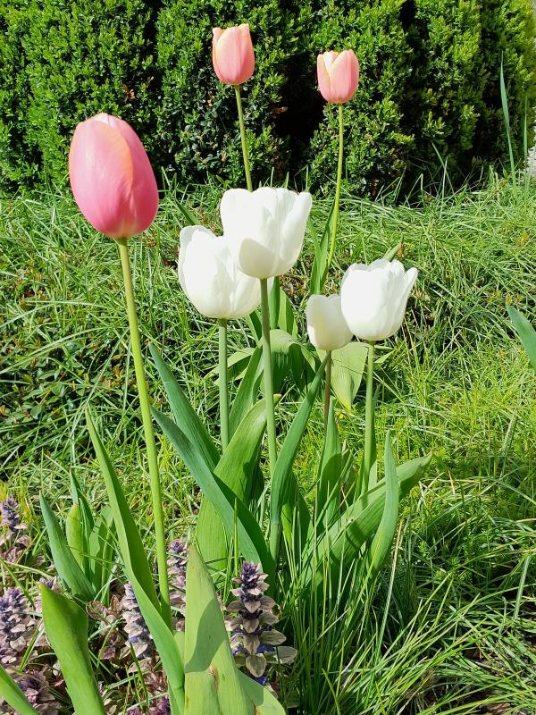 Die Tulpen auf der Nordseite. Eigentlich sind sie sehr gut wiedergekommen, haben aber leider Tulpenfeuer. Die ganz schlechten liegen schon im Biomüll, das hier ist ein sehr selektiver Beetausschnitt: