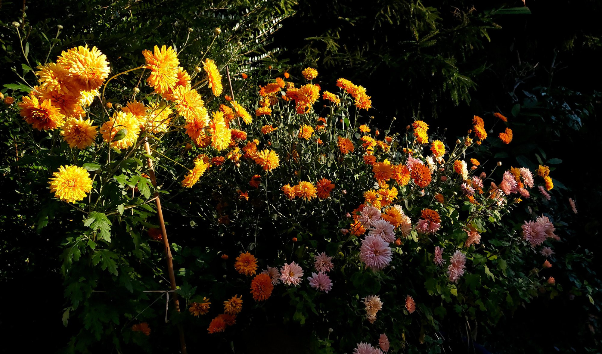 Auch wenn der Garten an einigen Stellen etwas chaotisch aussieht, macht es doch Spaß, seine Blicke schweifen zu lassen, und die leuchtenden Farben des Herbstes entschädigen für vieles, was im Sommer entweder nur mit Mühe über die Dürre zu bringen war, oder was durch heftige Regenfälle zu Boden gedrückt wurde. Im Moment sind die Temperaturen wieder angenehm, die Mücken piesacken nicht mehr gar zu sehr, und wenn es jetzt mal ein paar Tage am Stück trocken bleibt, komme ich auch weiter mit der Gartenarbeit. :)