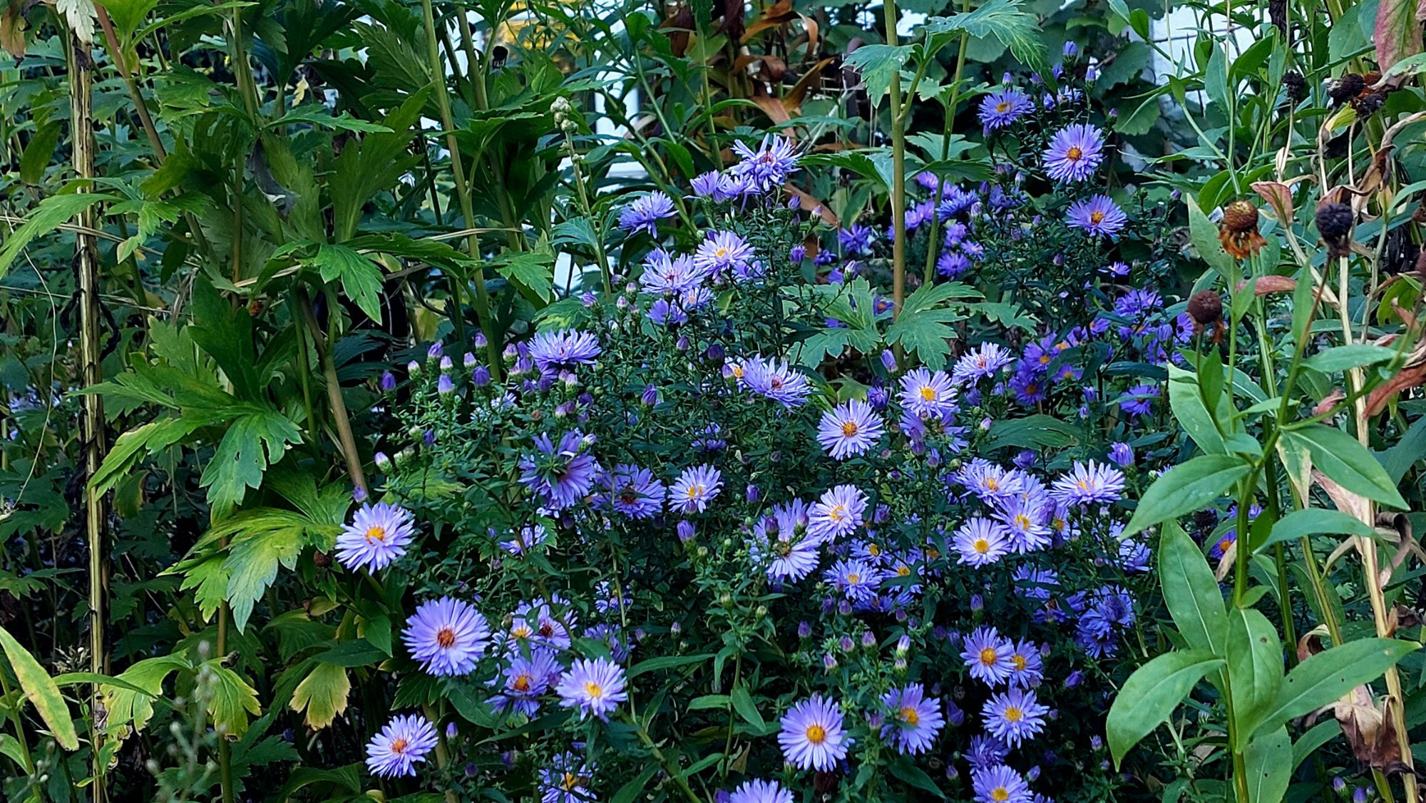 Das Beet am Zaun ist im Laufe der Jahre ziemlich wild geworden, aber hier sind ein paar vielversprechende Astern-Sämlinge aufgetaucht, die ich definitiv markieren und auch an anderen Stellen auspflanzen werde. Zwar blühen auch die umgekippten Exemplare üppig, aber es ist doch schöner, wenn die Stängel aufrecht stehen und man nicht so viel stützen muss. Der Kerzenknöterich ist auch etwas derangiert, blüht aber zuverlässig bis zum ersten Frost (der hier meist erst im November kommt), farblich passend dazu hat auch die Weigelie nochmal einige Blüten geöffnet.