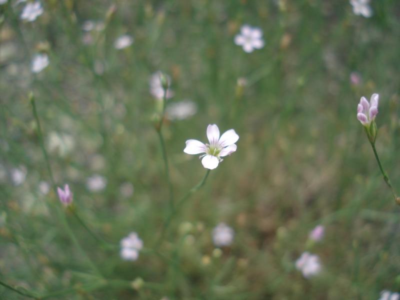 Ganz kleine Blüten max. 1 cm Durchmesser, Farbe Hell-Rosa/Hell-Lila, filigranes graugrünes Laub, steht mager und vollsonnig, vermehrt sich stark über Aussaat.