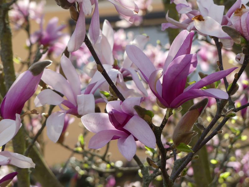 Eine unserer normalen M. x soulangeana. Diese hat wegen eines geschützten, schattigen Standes unter einer Kastanie einen spärlichen Knospenansatz. Dafür haben die Blüten keine Frostschäden.