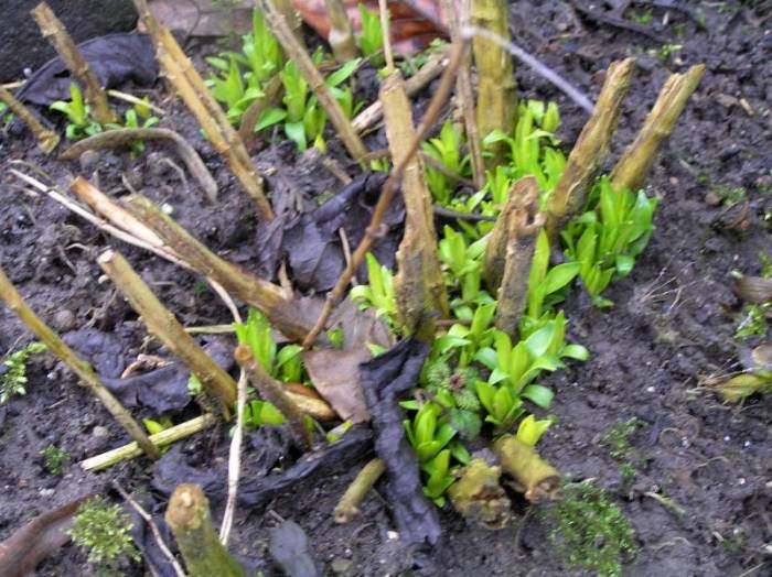 Phlox steht schon mit neuen frischgrünen Trieben aus der Erde.
