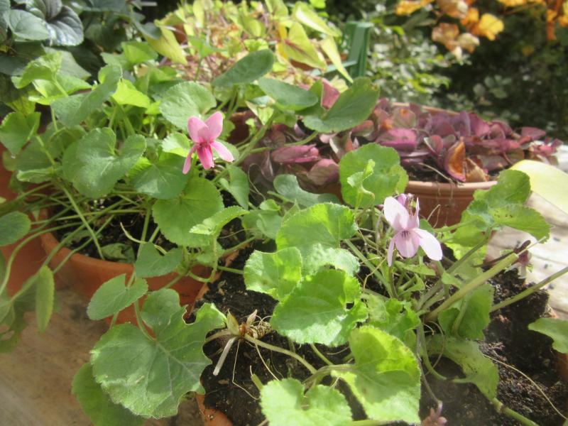 Hier geht der Veilchenherbst bei diversen Sorten weiter, nie voll, immer wieder mal einzelne oder zwei/drei Blüten. Heute Nachmittag schien die Sonne, was dann reichte, dass der Duft unterschwellig in der Luft lag, klasse! Auf dem Bild stellvertretend links vielleicht ein Sämling von `Coeur de Alsac´ `Coeur d'Alsace´ (hätte was Anderes sein sollen) und rechts `Orchid Pink´, mit ihrer fein ziselierten Schlundstreifung.