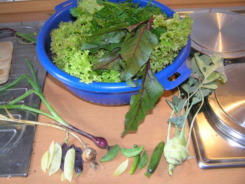 Zwei im Frühbeet vergessene Kohlrabis, die mehr Elefantenohrenblätter hatten, als sie dick waren (Weiß jemand, ob man auch die größeren Blätter oder die dicken Blattstiele verwerten kann? Ich habe zur Zeit leider keine Kaninchen mehr...., irgendwo las ich mal was von Kohlrabiblattrouladen, hat das schon mal jemand probiert?), außerdem ein paar späte Möhren, Gurken, geschossene Zwiebeln.@Aella: Was machst du mit den Möhrenblättern?
