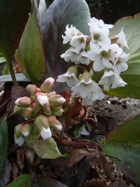 Mir ist kein Unterschied bei den blühenden Bergenien aufgefallen, Blätter grün, Blüten rosa