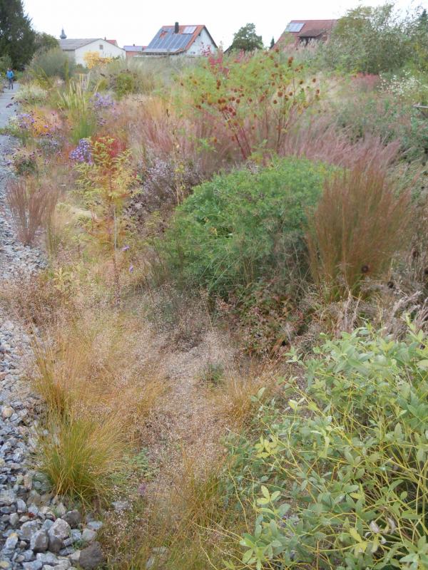 Gut gefallen hat mir auch im hinteren Bereich der Anlage eine Art Wassergraben (mit grobem Splitt ausgelegt) der den Weg von den aufgeschütteten Beeten trennt. Dazwischen immer wieder beeindruckende Exemplare von Glycyrrhiza yunnanensis , dem chinesischen Süßholz (Halbstrauch mit den rotbraunen Samenbällchen).