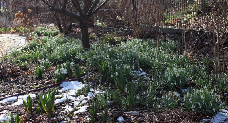 Da ich über keine Wiesen verfüge, wachsen meine Schneeglöckchen im Staudenbeet. Aber schön weiß ists mittlerweile schon.