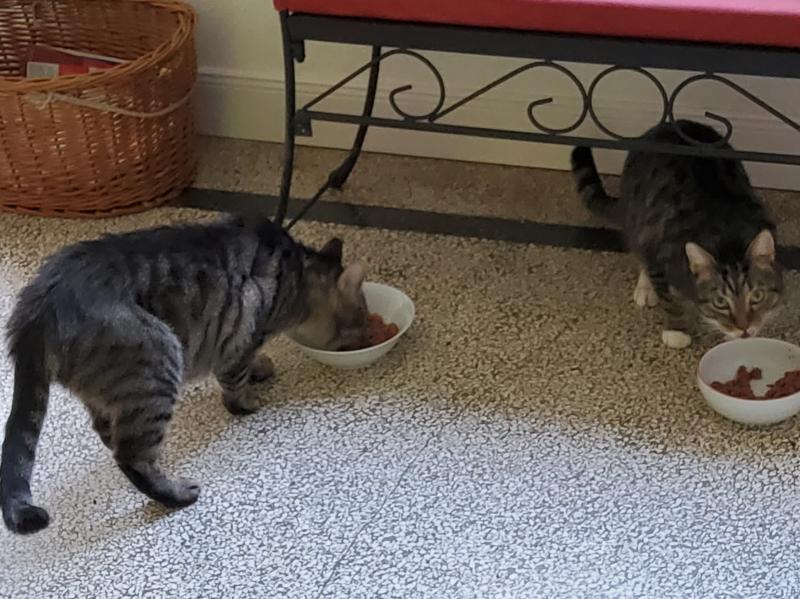 Es wird mit Kalle, er kommt jetzt schon in die Küche, wenn ich die Näpfe auffülle, und ich darf drin bleiben. Anfangs fraß er sicherheitshalber aus Bobos Napf, die beiden verstehen sich wirklich gut, köpfeln, streichen umeinander rum, raufen. Foto leider nicht gut, das Tablet kämpft mit den Streifen und dem gesprenkelten Fußboden.