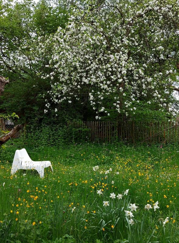 Die untere Wiese war früher eine Pferdekoppel, nach und nach kommen die Blumen zurück ( mit ein bißchen Narzissennachhilfe...)