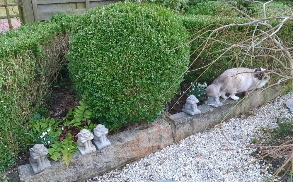 Dann mal wieder Katze mit Narzissen, Buchshecken, Dicentras, Tulpen, Eiben und Hellis im Kübel, damit auch andere wieder mitmachen können.