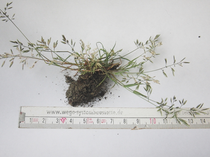 Ein Sommergras, es ist recht klein, eher flach wachsend, 10 bis höchstens 15cm im Durchmesser. Feine Halme, dunkelgrün. Die Blütenstände erinnern von der Form her ein wenig an Hirse (edit: stimmt nicht, eher Poa annua-ähnlich).