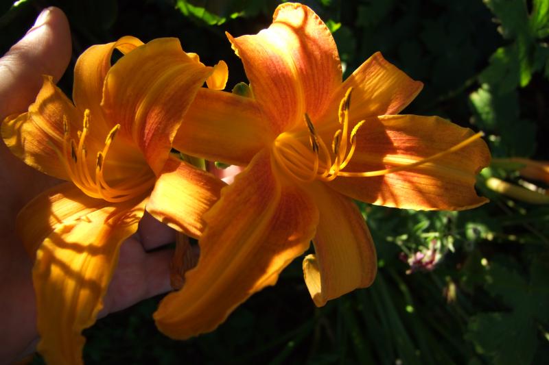 Hier brauche ich mal Hilfe.Es ist eine alte Sorte,könnte es Rajah sein?Sie ist nicht so hoch wie Jean und noch etwas kleinblütiger und hat orangerote Sommersprossen.Sie blüht noch im tiefstem Schatten.