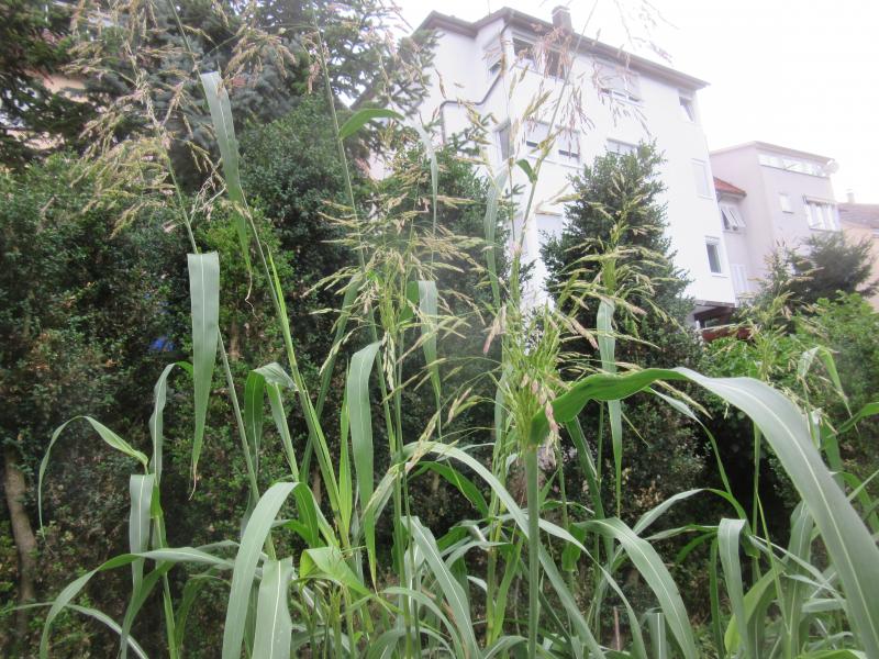 Ist dieses Gras Sorghum bicolor, bzw. eine Form davon? Nach den Google-Bildern soll es auch so lockerblütige geben. Kam ziemlich sicher mal mit Vogelkörnerfutter auf einen Gartenabfallhaufen (Kompost ist zuviel der Ehre). Wird riesig, +/- zwei Meter, hält sich seit ein paar Jahren, wird aber beständig deutlich weniger, da vor der Samenreife abgeschnitten. Dachte bisher immer einjährig/nicht winterhart und, dass eben noch ein paar keimfähige Körner im Boden seien. Gestern Abend habe ich dann doch mal an einem Stumpf gezogen und einen Ausläufer gefunden. Einjährig ist es also wohl schonmal nicht, womöglich also doch winterfest?