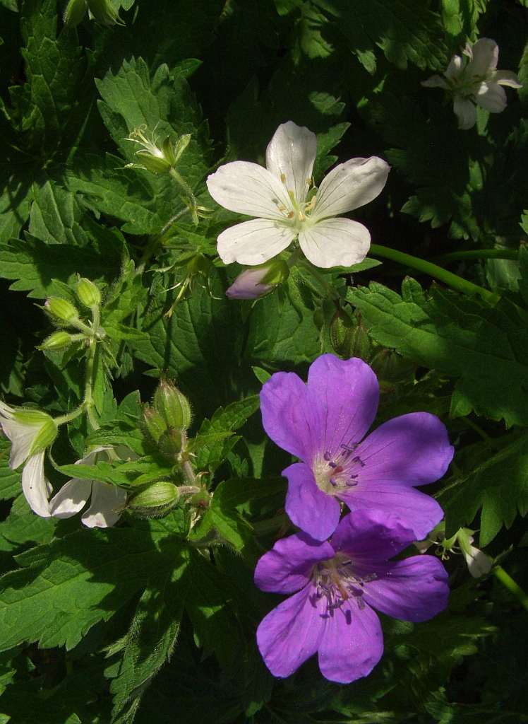 Geranium phaeum versamt sich hier bei uns im ziemlich schweren, aber nur leicht kalkhaltigen Boden sehr gut, allerdings die dunkelblühenden (violett und purpur) Formen stärker als die hellen.Auch ein Selbstversamer ist G. sylvaticum, wobei zu gleichen Teilen weiß- und violettblühende Pflanzen entstehen, manchmal direkt nebeneinander, wie hier. Die Knospen der weissen sind übrigens häufig violett getönt wie die auf dem Bild gezeigte.