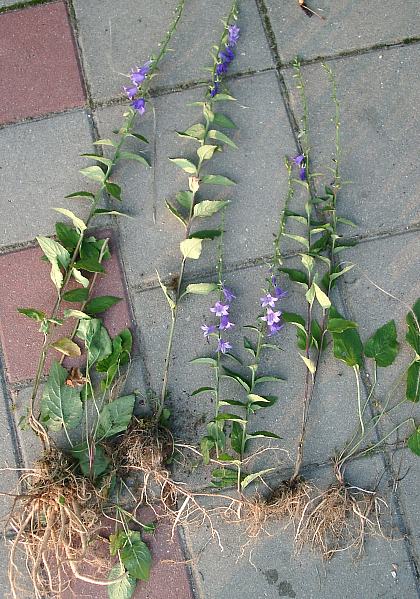 @phalainadas mit der campanula rapunculoides + rapunculus hatten wir in einem thread schon mal. bin gerade beim abendl. spaziergang mit meinem hund an c. rapunculus vorbeigekommen...das ist deine keinesfalls...ich würde sogar behaupten, dass ist die gefürchtete c. rapunculoides! vorsicht bei scheinbar horstigen wachstum! das macht die nur ne zeitlang und dann geht die post ab. ich hab das unkraut zu meinem tiefsten bedauern auch unwissend in meinem garten geholt...vor jahren...ich kriegs nicht wieder raus. sie macht sich gut mit den straffen stängeln + der hübschen großen glockenblumenblüten, kein zweifel, aber sie durchwuchert einfach alles.hier mal eine erlegte "campanula-strecke"